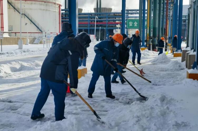 面對突如其來的大雪嚴寒極端天氣,公司迅速啟動了《惡劣天氣專項應急預案》,明確劃分各部門工作職責及掃雪專區,持續開展鏟冰除雪工作。各部室分別組建清雪突擊隊,對裝置區及辦公區等積雪深厚區域進行及時處置。公司還安排一臺灑鹽水罐車和兩臺裝載機對主干道進行了全面清理,確保道路安全通暢,保障生產正常運轉。