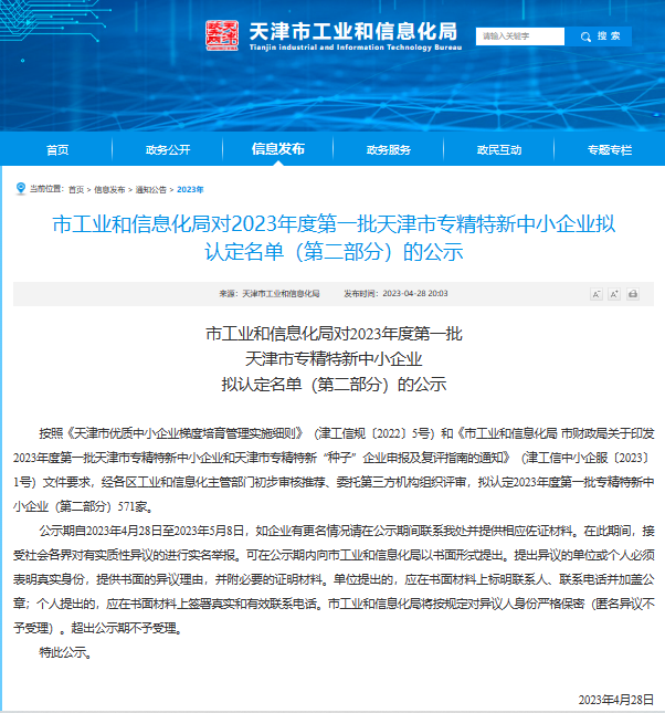 近日,市工業和信息化局、市財政局發布了《市工業和信息化局對2023年度第一批天津市專精特新中小企業擬認定名單的公示》,渤化集團所屬企業天津海晶科技發展有限公司、天津市合成材料工業研究所有限公司、天津市敬業精細化工有限公司、天津七二九體育用品有限公司、天津渤海物聯科技股份有限公司、天津渤化環境修復股份有限公司、天津市化學試劑研究所有限公司、天津渤化安創科技有限公司、天津市精美特表面技術有限公司共9家被認定為2023年度第一批天津市專精特新中小企業。