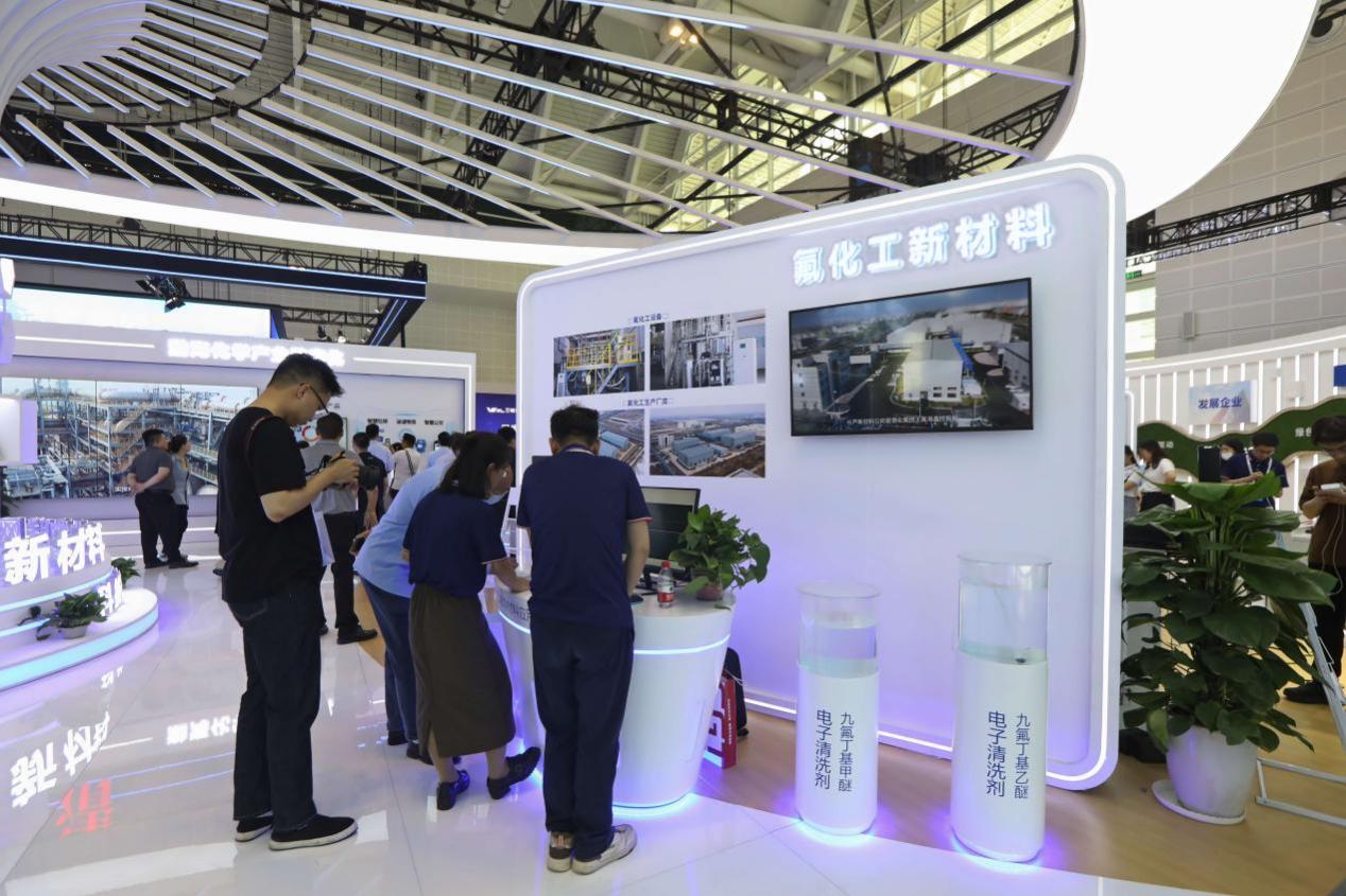 “正在運行的計算機服務器會產生七八十攝氏度的高溫,將服務器浸沒在全氟聚醚流體中可保持恒溫40攝氏度左右,與傳統風冷相比大大降低了功耗。”在氟化工新材料產業展區,長蘆新材料公司自主研發的以全氟聚醚流體為冷卻液的單相浸沒式液冷主機吸引了眾多參觀者駐足觀看,中科曙光、百度、騰訊、華為、云創科技等互聯網企業均表示希望深入了解,氫氟醚等含氟產品也獲得了力神電池及半導體設備清洗廠家的廣泛關注。