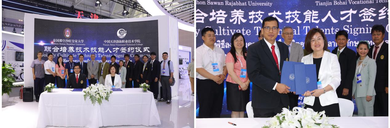 渤海職院與泰國那空沙旺皇家大學舉行的聯合培養技術技能人才簽約儀式在展會期間同步進行。雙方將就聯合培養本科、碩士技能人才開展緊密合作。2016年,渤海職院建設了中國境外首個“魯班工坊”,搭建起了天津職業教育與世界對話、交流的橋梁,成為輸出中國職業教育軟實力的領跑者,本次簽約也將是助推泰國魯班工坊高質量發展、打通學生學歷上升通道、構建人才成長‘立交橋’、培養應用技能型人才的一次有益嘗試,其相關成果受到了馬達加斯加魯班工坊外賓、泰國外賓以及社會各界的一致好評。