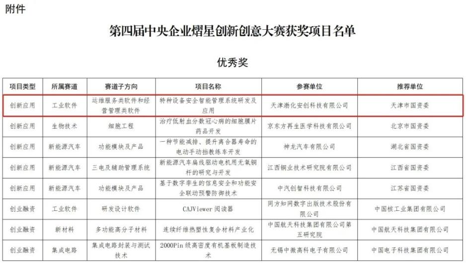 日前,國務院國資委辦公廳正式發布《關于第四屆中央企業熠星創新創意大賽獲獎名單的通報》,渤化集團所屬天津渤化安創科技有限公司(簡稱“渤化安創”)申報的“特種設備安全智能管理系統研發及應用”項目,歷經一年的征集、初選、復選、導師輔導、對接路演等多項賽程,榮獲第四屆中央企業熠星創新創意大賽優秀獎。