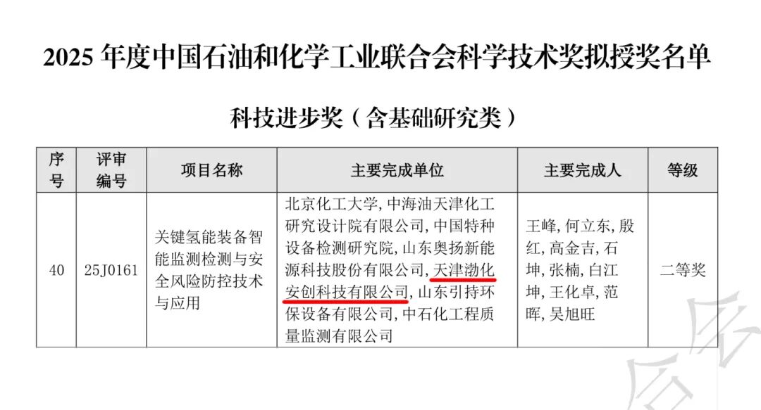 日前,中國石油和化學工業聯合會發布《2025年度中國石油和化學工業聯合會科學技術獎擬授獎名單公示》,渤化集團所屬天津渤化安創科技有限公司(簡稱“渤化安創”)參與完成的“關鍵氫能裝備智能監測檢測與安全風險防控技術及應用”項目,憑借在氫能安全領域取得的突破性成果,成功斬獲中國石油和化學工業聯合會科技進步二等獎。