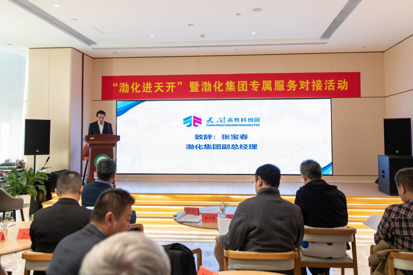 為認真貫徹市委市政府“十項行動”,更好推動天開高教科創園(以下簡稱天開園)高質量建設,落實落細天津渤海化工集團有限責任公司(以下簡稱渤化集團)23項高質量提升工作,加速科技成果在津落地轉化。11月16日,在市國資委、市科技局的聯合推動下,渤化集團聯合天津天開發展集團有限公司(以下簡稱天開集團)成功舉辦“渤化進天開”暨渤化集團專屬服務對接活動,渤化集團所屬近30家企業走進天開園與園區企業深入對接交流,并舉行渤化集團分支機構入園揭牌儀式和天開園創業導師聘任儀式。市國資委規劃發展處處長周華安、渤化集團副總經理張寶春參會并致辭,市科技局營商環境處處長華強、天開集團董事長張雪穎、副總經理王楊、市國資委規劃發展處張麗出席本次活動,渤化集團科技創新部、所屬二級企業和重點三級企業、天開園重點入駐企業共70余人參加本次交流對接。