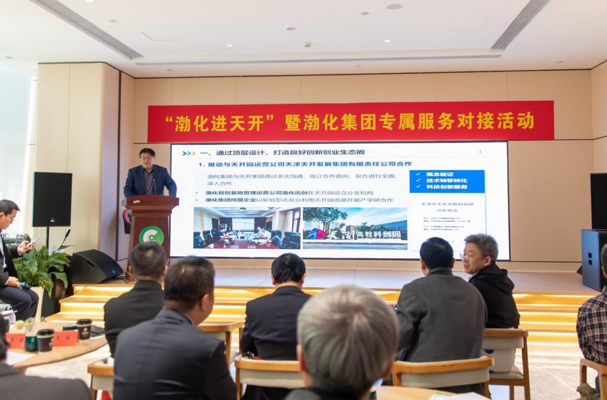 在對接交流環節中,渤化集團進行“充分利用天開高教科創園,賦能渤化集團科技創新”的主題介紹;海晶集團、渤海精細和渤化資產3家企業分別進行了中試資源、應用場景及合作需求發布,天開園企業北洋重工、天開環境、耀科新材料、宏菱智慧、集思拓、碳平衡、天開聯合、天大澤源、南科優儀等9家企業分別進行技術成果和服務能力分享介紹。