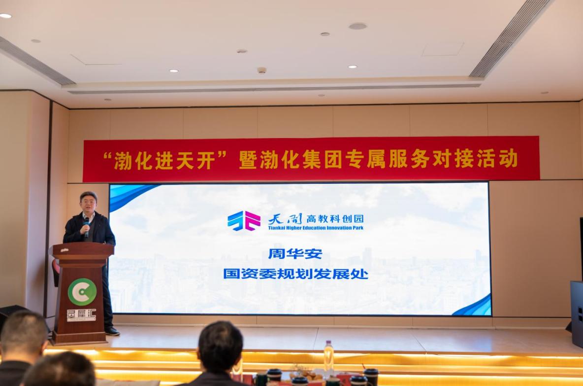 天津市國資委規劃發展處處長周華安發表講話,他表示,本次對接活動別開生面,圍繞化工產業領域進行了深入對接交流,為本次活動點贊!市國資高度重視本次對接活動,渤化集團作為我市化工產業“鏈主”企業,在科技創新領域走在國資系統前列,整體實力和科技創新能力較強;天開園是盡全市之力打造的“科技創新策源地”“科研成果孵化器”和“科技服務生態圈”,為企業創造了全面、良好的發展條件,入園企業更是藏龍臥虎,走在行業創新領域前列,下一步天開園入園企業要在化工領域加強合作,推動化工產業高質量發展。他指出,天津市國資委作為市管企業的監督管理部門,主動服務天開園及入園企業高質量發展,近期將組織邀請市管企業、央企駐津企業、外省市相關產業鏈科技創新企業舉辦第二次“百企進天開”活動,主要圍繞入園企業的成果轉化、市場開拓進行全方位的對接,同時發揮以渤化集團為代表的國有企業優勢,進一步開放共享重點實驗室、應用場景等創新資源,加大合作范圍、加強合作力度,市國資委將當好橋梁和紐帶,為企業發展做好服務。