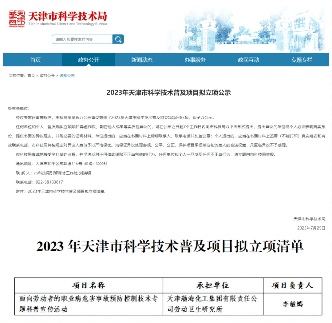 科普立項傳捷報 科研深耕譜新篇 | 渤化集團勞動衛生研究所獲2023年天津市科學技術普及項目立項
