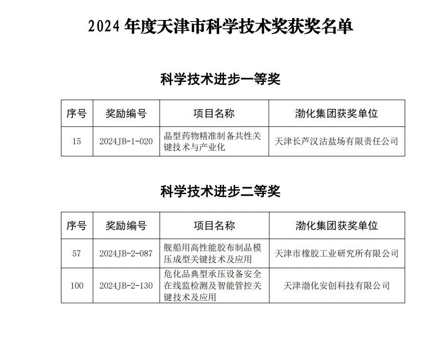 4月29日,天津市人民政府發布《天津市人民政府關于頒布2024年度天津市科學技術獎的決定》,渤化集團榮獲三項2024年度天津市科學技術獎。其中,天津長蘆漢沽鹽場有限責任公司參與的“晶型藥物精準制備共性關鍵技術與產業化”項目榮獲2024年度天津市科學技術進步一等獎;天津市橡膠工業研究所有限公司作為第一承擔單位的“艦船用高性能膠布制品模壓成型關鍵技術及應用”項目和天津渤化安創科技有限公司作為第一承擔單位的“危化品典型承壓設備安全在線監檢測及智能管控關鍵技術及應用”項目分別榮獲2024年度天津市科學技術進步二等獎。