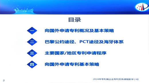 主講專家來自國家知識產權局專利局初審及流程管理部,培訓重點內容涉及向國外申請專利途徑(巴黎公約、PCT、 海牙協定)流程,及去主要國家(美國、歐洲、日本)的申請程序,尤其是向國外申請專利的程序加快策略、費用節省策略等。