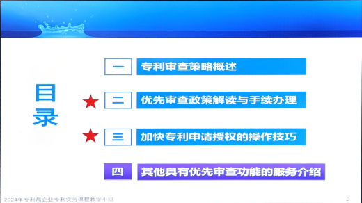 主講專家來自國家知識產權局專利局初審及流程管理部,培訓重點內容涉及優先審查、延遲審查、集中審查等政策,特別是詳細介紹優先審查程序,關于加快專利申請授權的操作技巧,對交底書的撰寫、答復審查意見等策略。