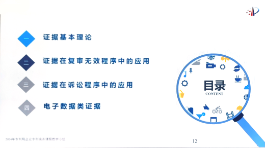 主講專家來自國家知識產權局專利局復審和無效審理部,培訓重點內容涉及各類證據在復審無效程序中的應用、證據在訴訟程序中的應用,以及最近比較熱門的電子證據相關知識等。