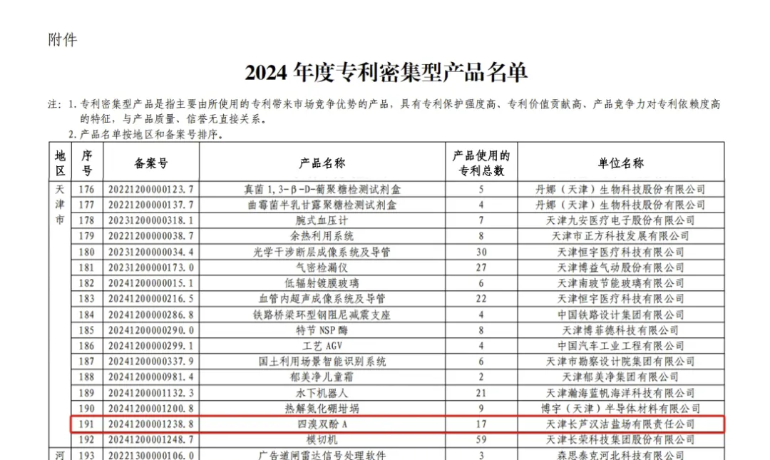 國家認定!漢沽鹽場四溴雙酚A成功入選國家專利密集型產品名單!
