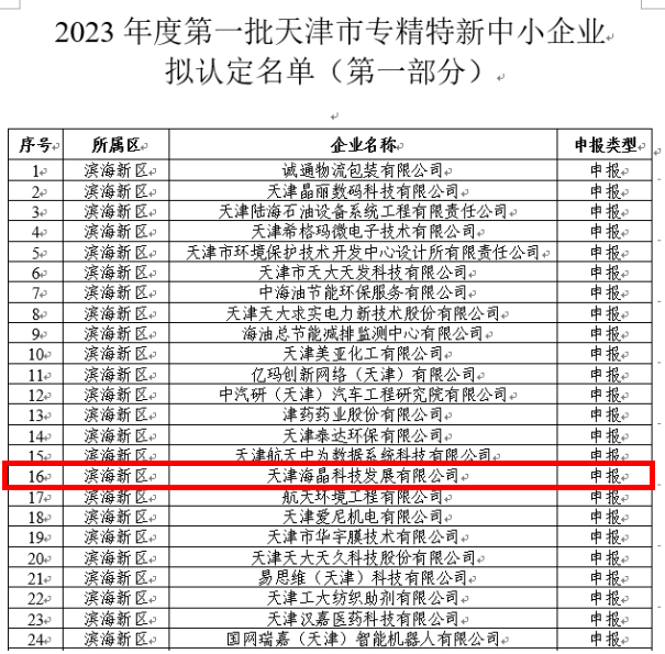 近日,市工業和信息化局、市財政局發布《市工業和信息化局 市財政局關于印發2023年度第一批專精特新中小企業認定名單(第一部分)的通知》,集團公司所屬海晶科技、合材所2家單位被認定為2023年度第一批天津市專精特新中小企業。