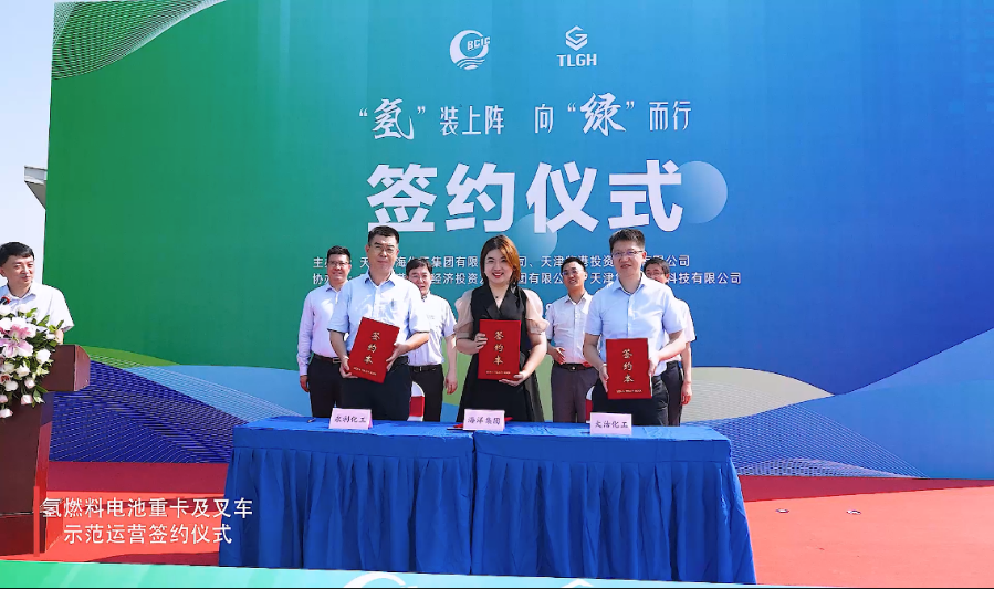 同時,大沽化工、渤化永利化工與臨港海洋集團分別簽訂了《氫燃料電池重卡示范運營戰略合作協議》《氫燃料電池叉車示范運營戰略合作協議》?,F場同步啟動保稅區首批氫燃料電池重卡示范運營項目。