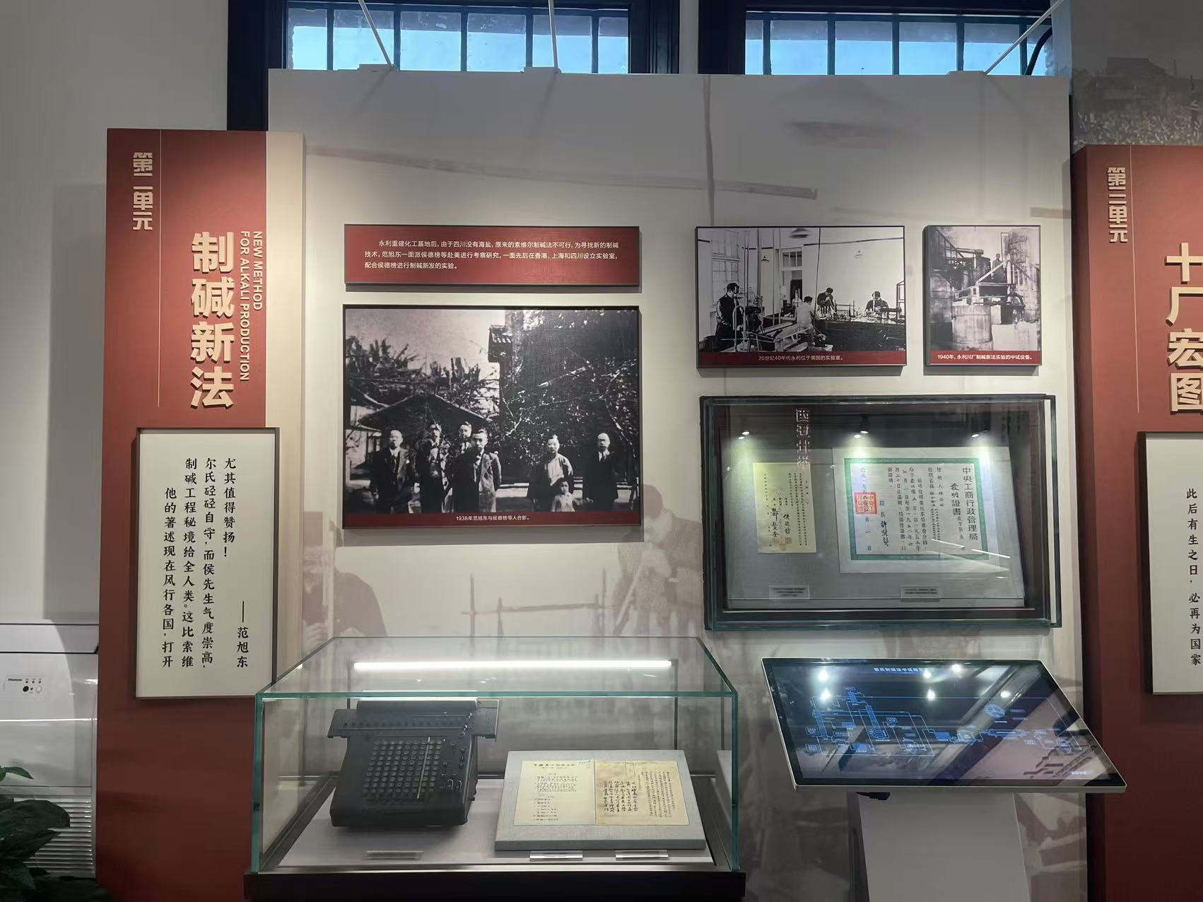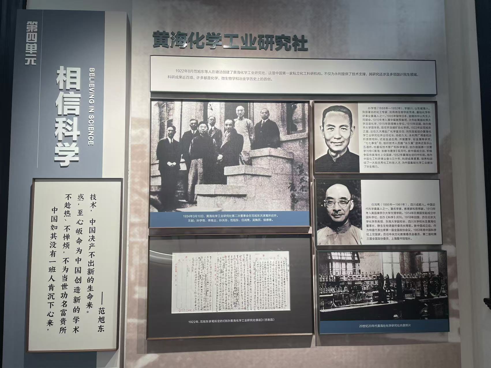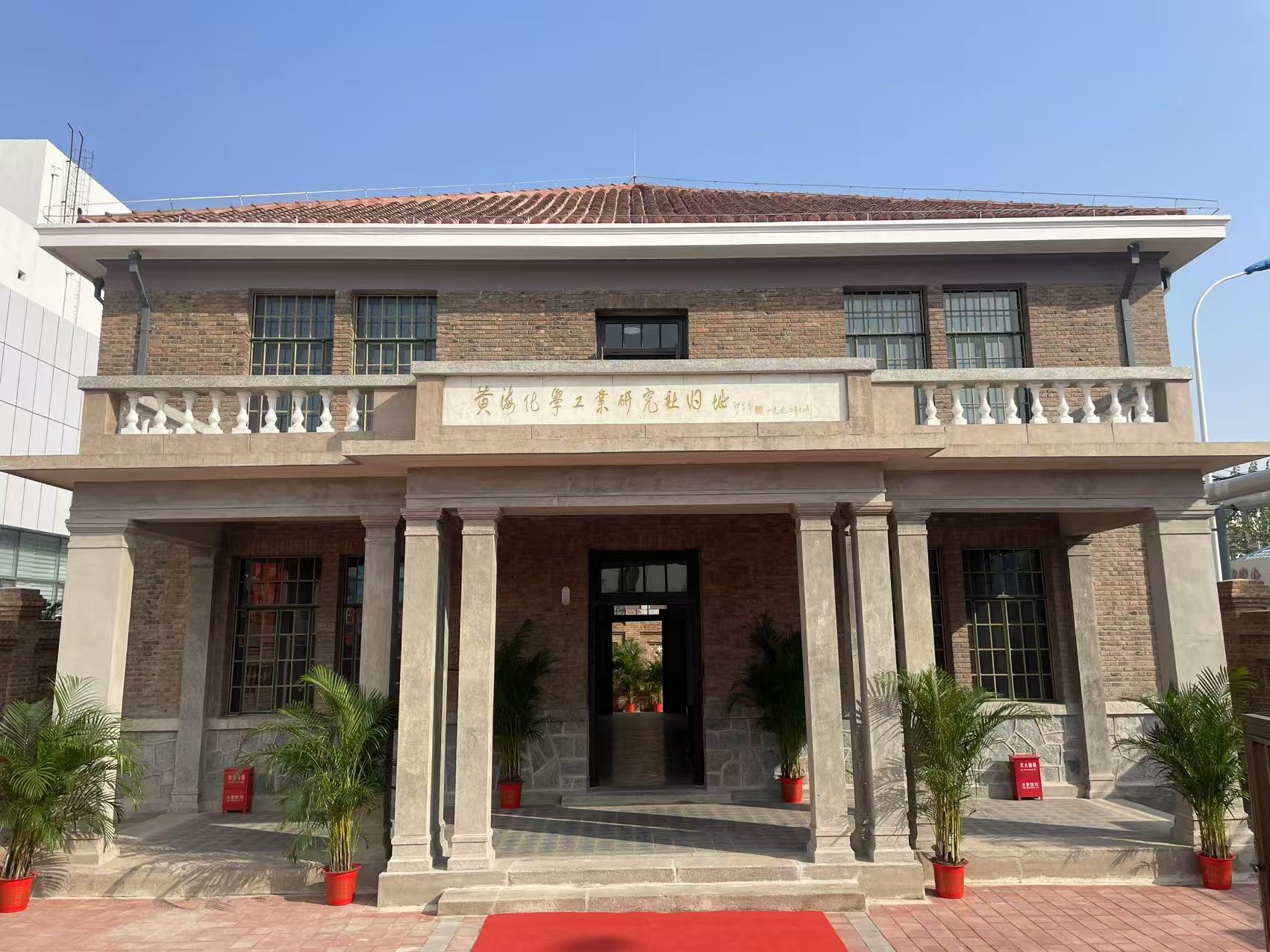 黃海化學工業研究社舊址坐落于天津市濱海新區解放路138號,天堿俱樂部東側,是2013年公布的第七批全國重點文物保護單位。新修繕完成的范旭東紀念館建筑面積423平方米,常設《工業先導、功在中華——范旭東的光輝人生》展覽。展覽以“工業先導 功在中華—范旭東的光輝人生”為主題,通過“矢志報國、實業強國、西遷壯舉、立德立言、努力前行”等五個部分、十二個單元生動展示了20世紀初葉,我國近代著名愛國實業家范旭東率領李燭塵、侯德榜、陳調甫、孫學悟等民族化學工業先驅,秉持“為救國家危亡而辦實業”的赤子情懷,艱苦卓絕,鞠躬盡瘁,打造聞名海內外的化工生產科研集團——“永久黃”團體,打破多項國外“卡脖子”技術制約,開創我國純堿、化肥工業及微生物學研究先河,矢志為民族化學工業自立圖強、創新超越奮斗的光輝歷程。